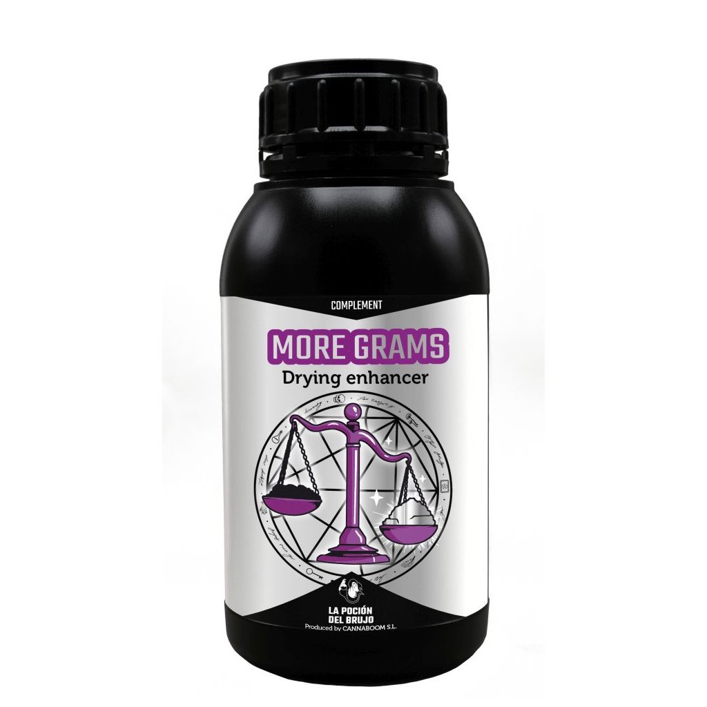 MORE GRAMS je světově unikátní přípravek: díky němu vaše plodiny v procesu sušení ztrácejí méně na hmotnosti. Funguje tak, že zvyšuje retenci vody v květu, opětovně hydratuje prostor mezi vlákny a umožňuje asimilaci této vody bohaté na živiny v závěrečné fázi kvetení. Organická hmota se zvýší těsně před řezem, což umožní, aby květ během fáze sušení ztratil o 10 % / 20 % méně hmotnosti.