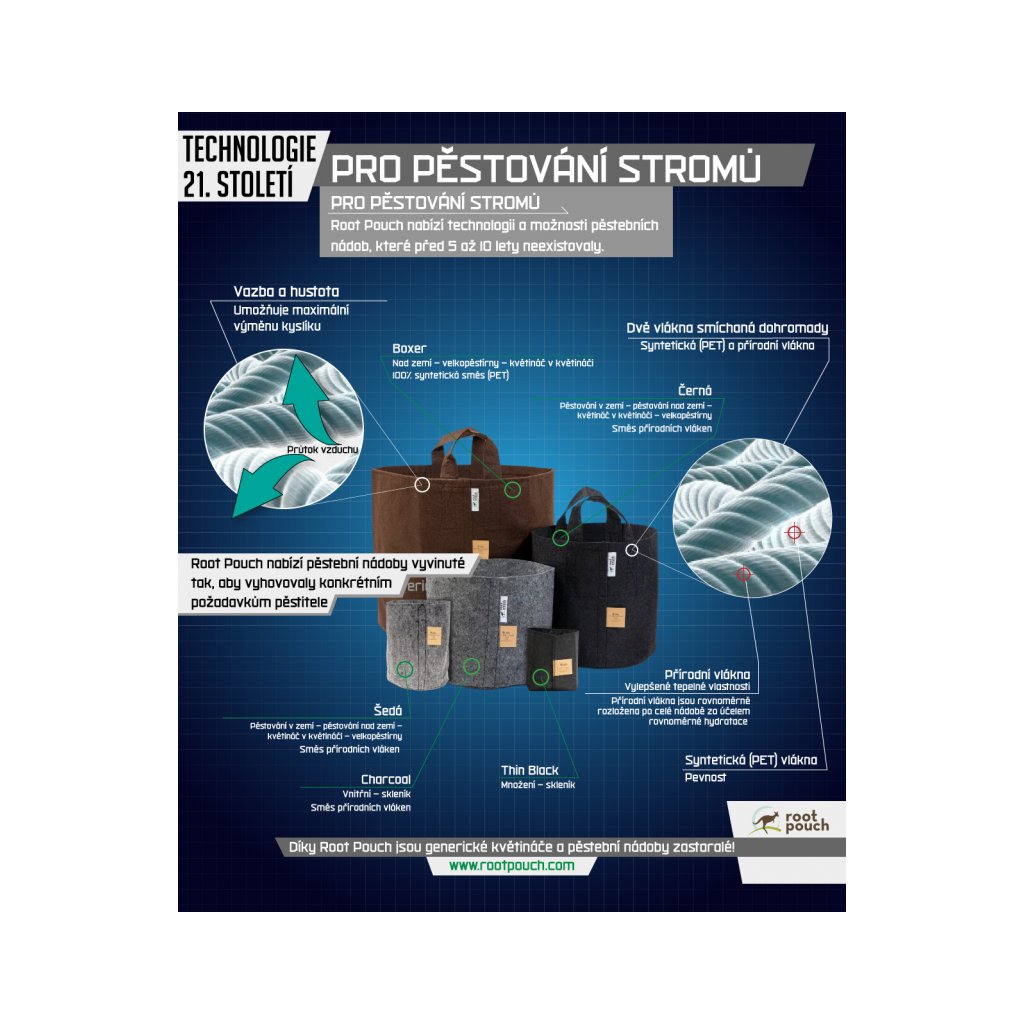 Black Line Root Pouch -černý textilní květníky vyrobené ze směsi recyklovaných pet lahví a přírodních vláken. Ty umožňují pěstování v zemi, čerpají vodu a živiny z okolní půdy a jsou dostatečně odolné pro pěstování nad zemí. Životnost je 4-5let při pěstování v zemi a také nad zemí vydrží až několik sezón! Objem: 16L, velikost 28x26cm.