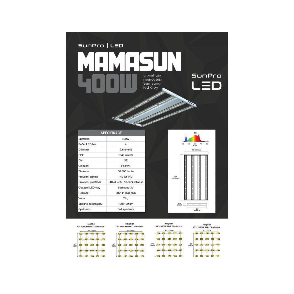 Sunpro SUNDOCAN 400W nahrazuje starší řadu MAMASUN 400W. Zařízení bylo inovováno o regulátor výkonu (0-25-50-75-100%) a lepší technologii chlazení. Se svými rozměry 111x58x3,7cm a váhou 7kg je tak ideální na pěstební plochu 1,2x1,2m.